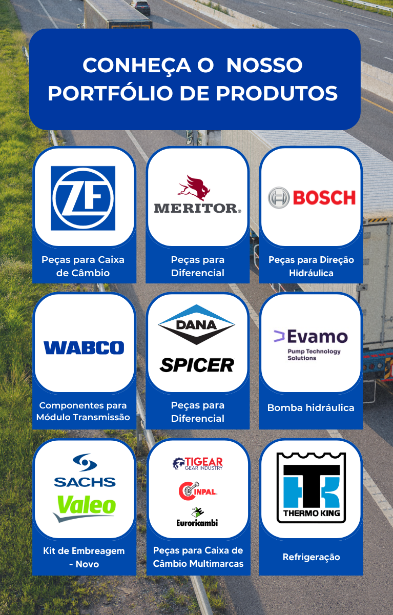 - Componentes de suspensão: barras de reação, pivôs, bandejas, articulações, tirantes e kits de reparo.